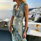 Αυτή η μακριά μποέμικη φορεσιά γοητεύει με την χρυσή απόχρωσή της και την ρέουσα γραμμή της. Οι λαμπερές λεπτομέρειες αναδεικνύουν τη σιλουέτα με διακριτικότητα. Ιδανική για τις καλοκαιρινές βραδιές, συνδυάζει άνεση και φυσική κομψότητα.