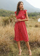 Αυτή η μακριά κόκκινη φόρεμα ενσωματώνει το μποέμ στυλ με μια δόση κομψότητας. Ο ρευστός σχεδιασμός της και οι λεπτές λεπτομέρειες την καθιστούν ένα κομμάτι-κλειδί για κάθε ντουλάπα. Ιδανική για ηλιόλουστες μέρες ή καλοκαιρινές βραδιές.