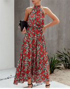 Αυτή η μακριά φόρεμα με μποχέμ στυλ διαθέτει λουλουδάτα μοτίβα και ρευστή γραμμή. Ο ψηλός γιακάς με κλείσιμο πίσω αποκαλύπτει απαλά τους ώμους.
