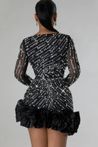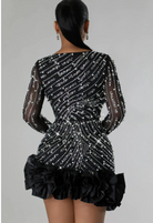 This form-fitting mini dress is adorned with sparkling crystals. Its deep V-neckline and fitted long sleeves offer a sophisticated silhouette. Perfect for evenings and special events.