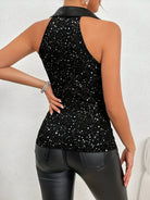 Esta blusa sin mangas combina elegancia estructurada y un brillo sutil para tus atuendos de noche. Su cuello de solapa aporta un toque sofisticado, mientras que su efecto brillante recuerda un cielo estrellado. Ajustada a la cintura, realza la silueta con estilo. Perfecta para brillar con confianza en tus salidas elegantes.