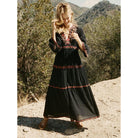 Tämä pitkä musta mekko tarjoaa sujuvan leikkauksen ja imartelevan V-pääntien. Täydellinen erilaisiin tilaisuuksiin, se yhdistää mukavuuden ja tyylin.