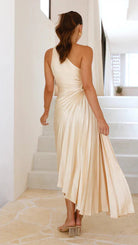 Tämä pitkä iltapuku viehättää rohkealla yhdellä olkaimella ja herkällä laskostetulla kankaalla. Sen istuva vyötärö korostaa siluettia elegantisti, kun taas sen virtaava viimeistely antaa sille hienostuneen ilmeen. Ihanteellinen loistamaan muodollisissa tapahtumissa tai erityisillallisilla.