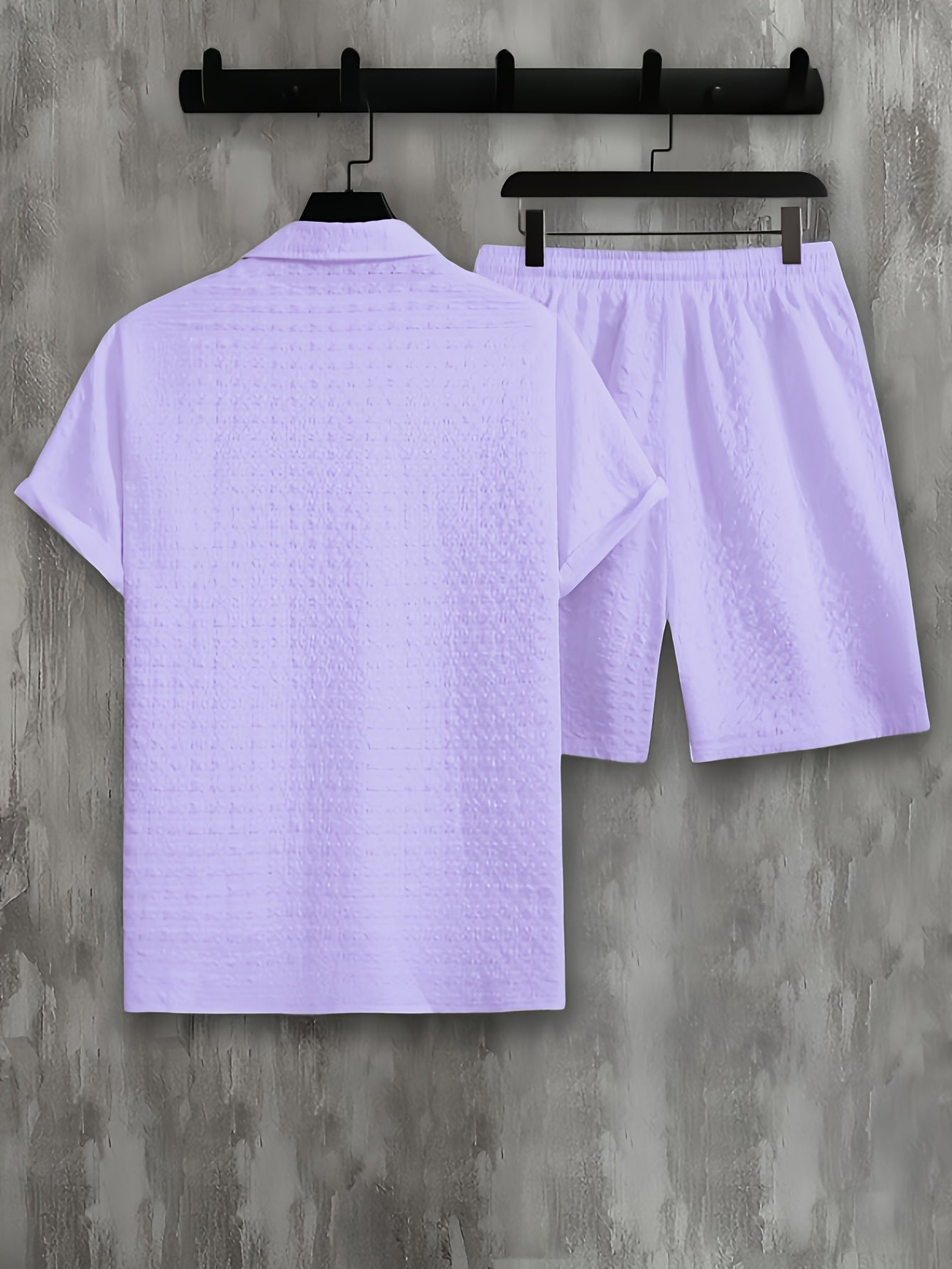 Tämä asuste yhdistää lyhythihaisen paidan nappisuljennalla ja säädettävät shortsit. Se tarjoaa rentoa leikkausta optimaalista mukavuutta varten. Ihanteellinen eri tilaisuuksiin, se yhdistää tyylin ja käytännöllisyyden.