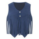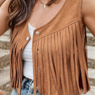 Cette veste sans manches présente des franges élégantes et des détails de boutons raffinés. Son design intemporel s'adapte à diverses occasions. Parfaite pour superposer sur vos tenues préférées.