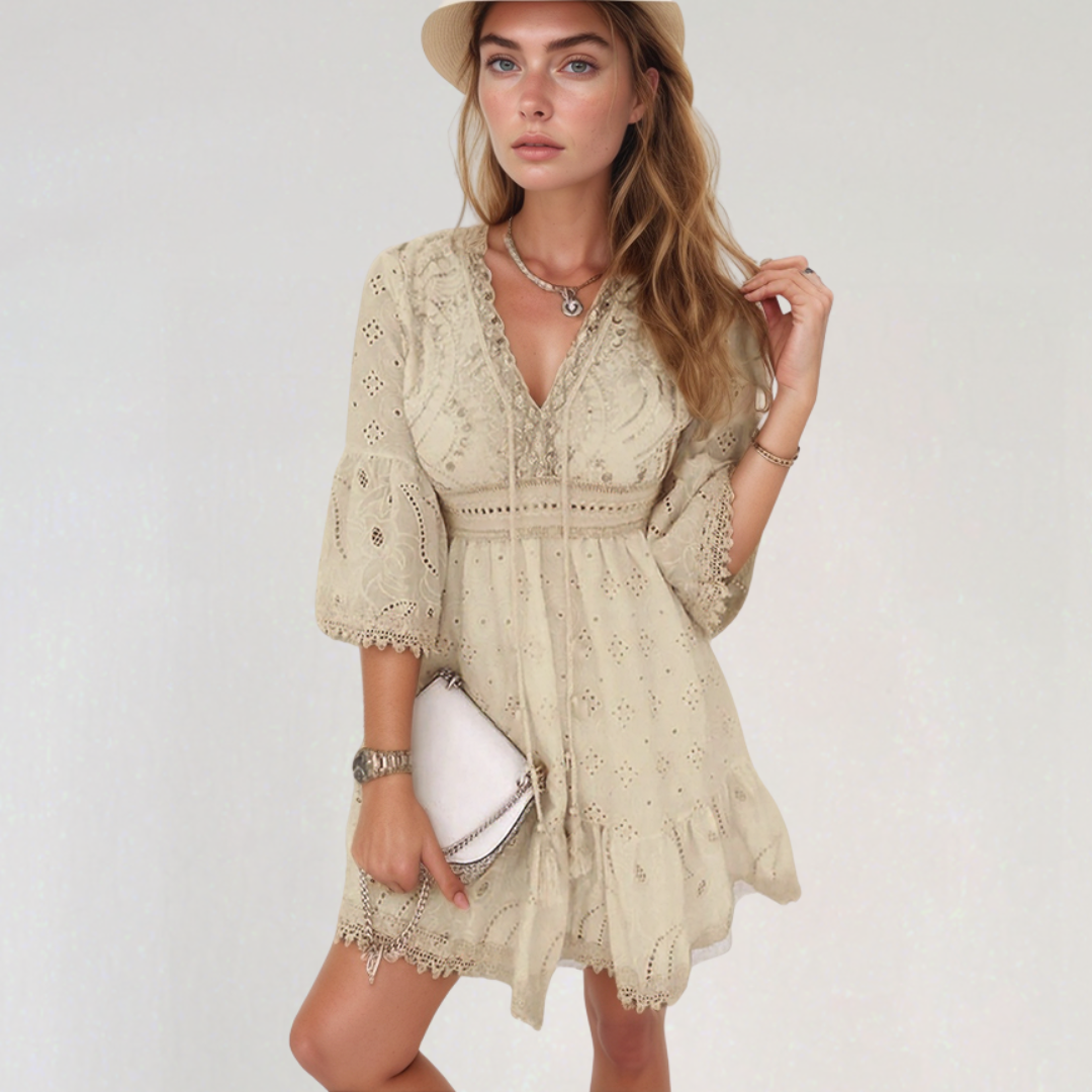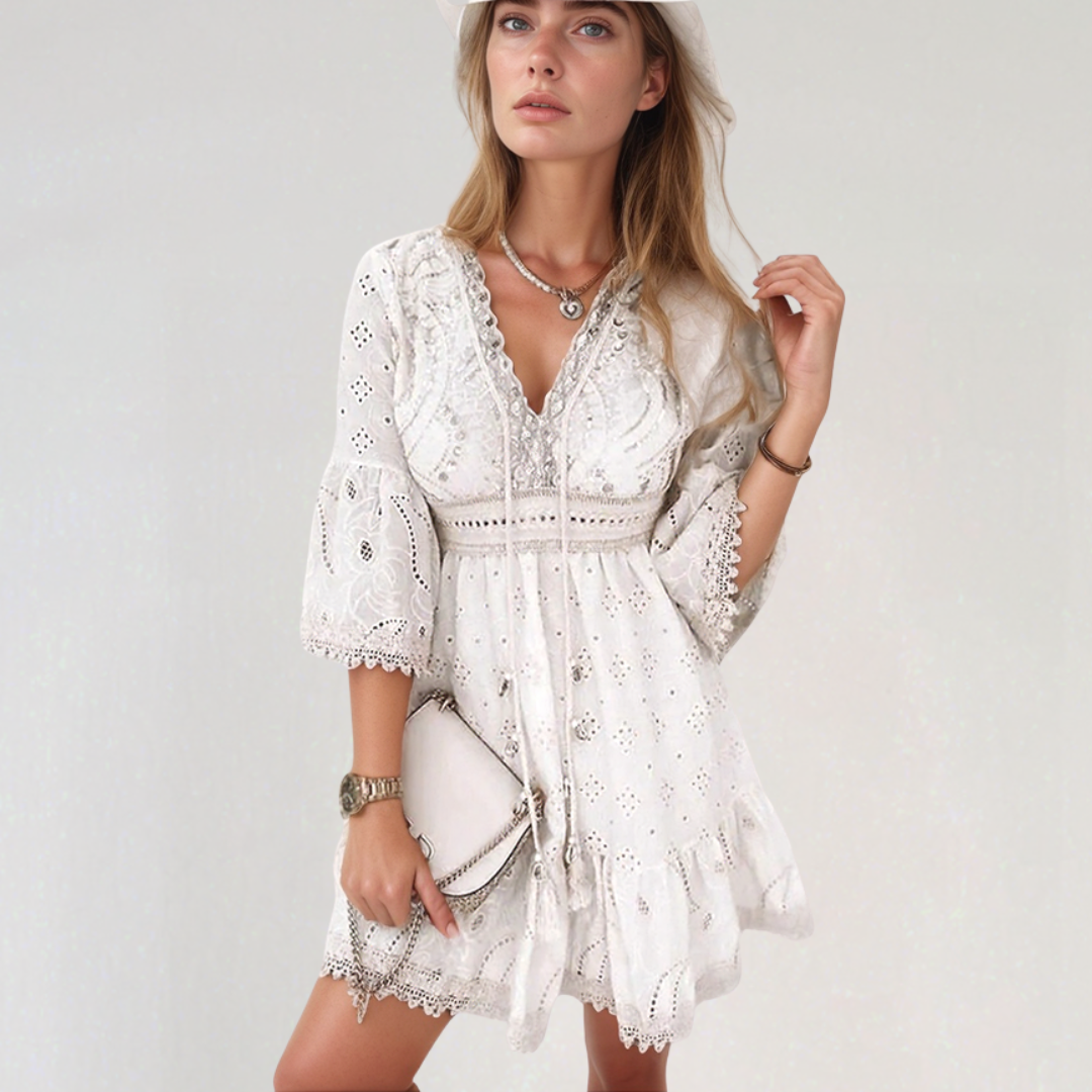 ג'יזלין | שמלת קצרה בוהמית – רקמות עדינות ושרוול V