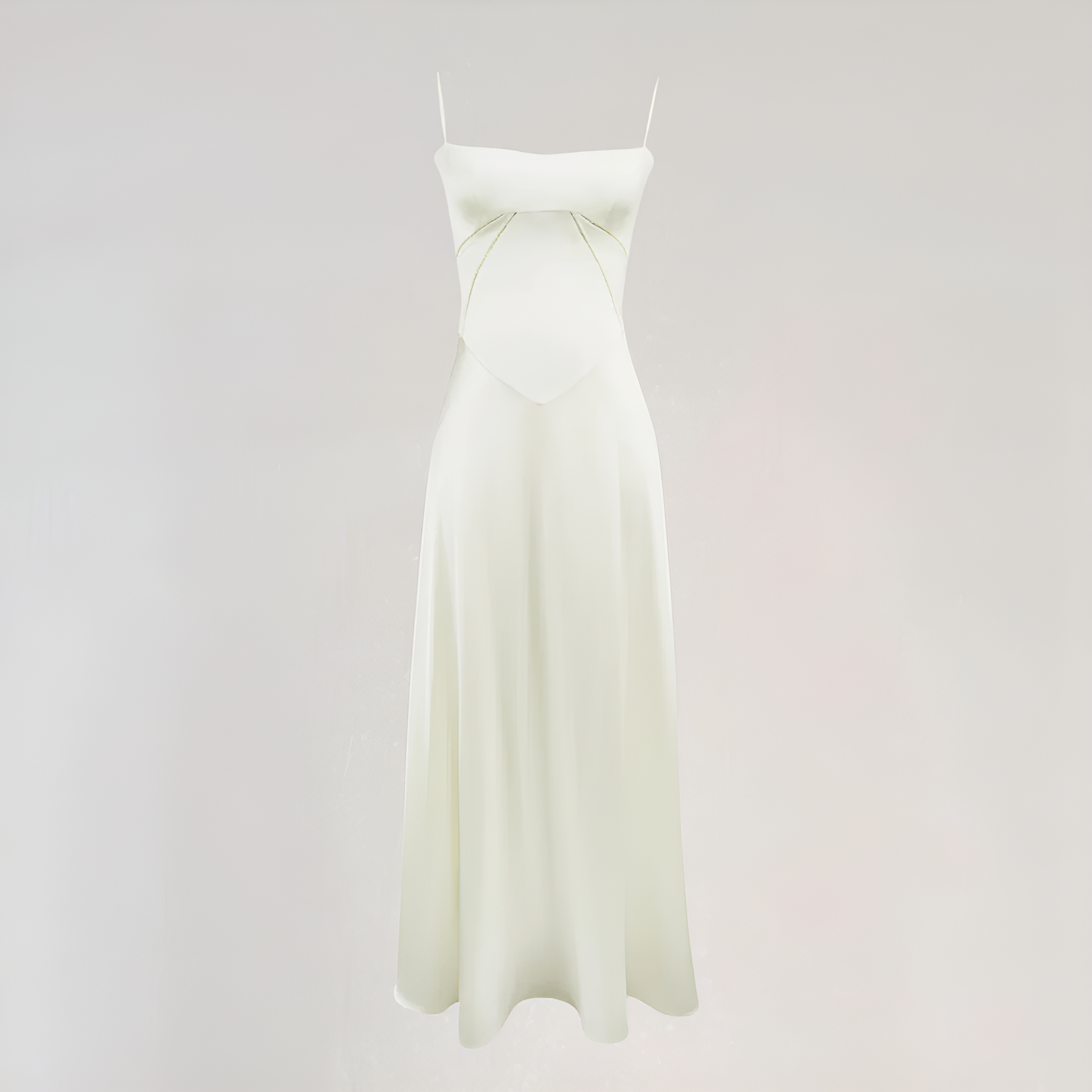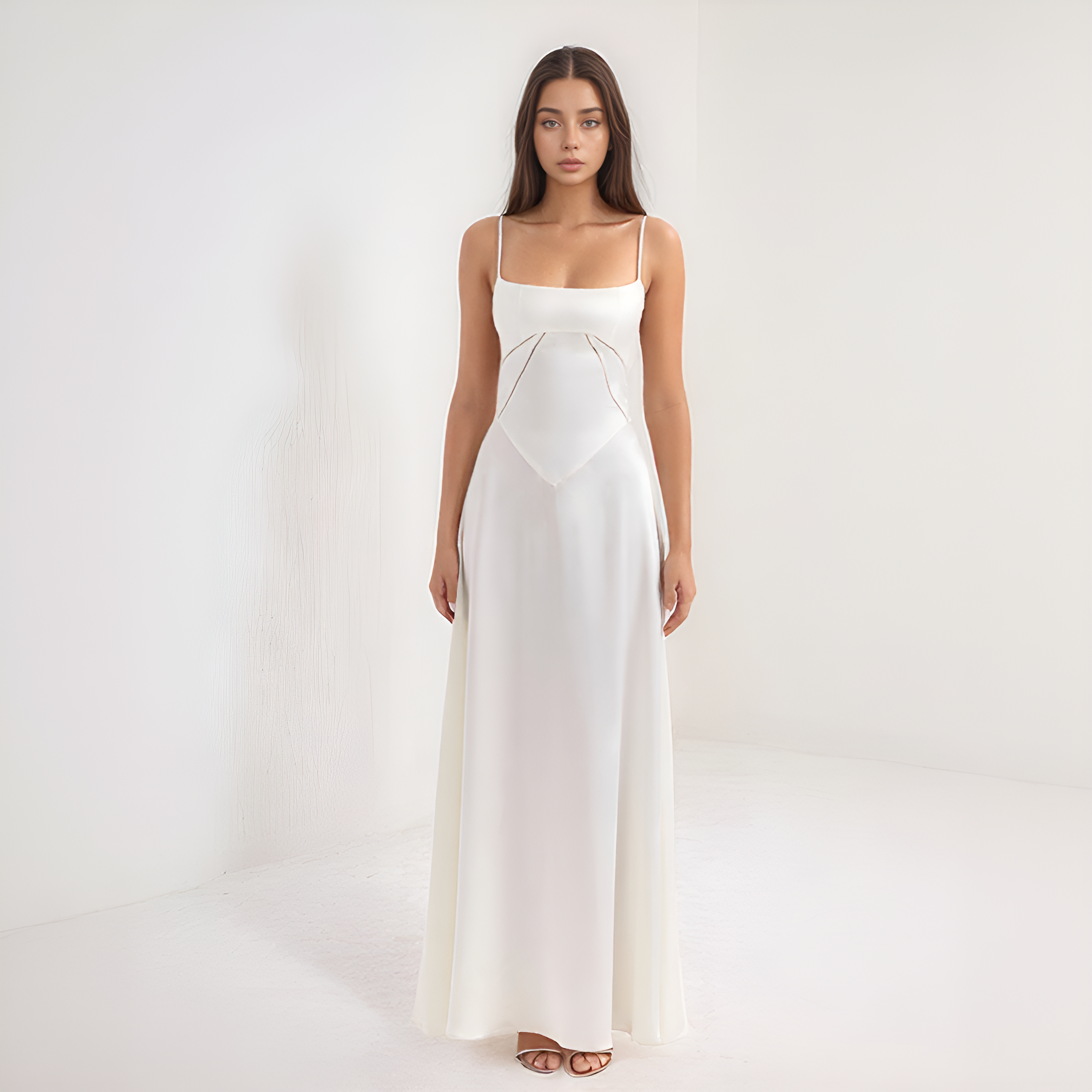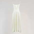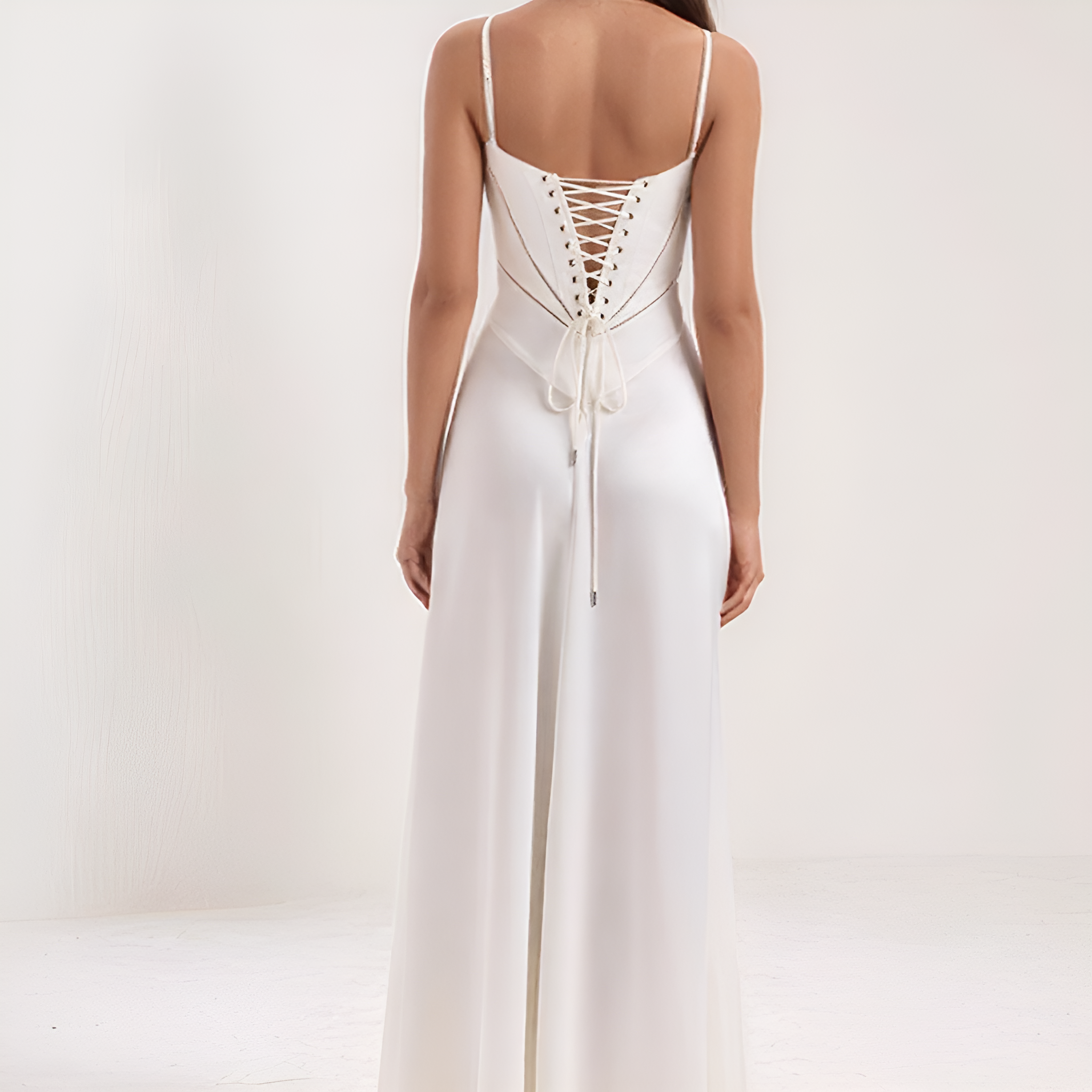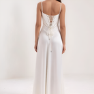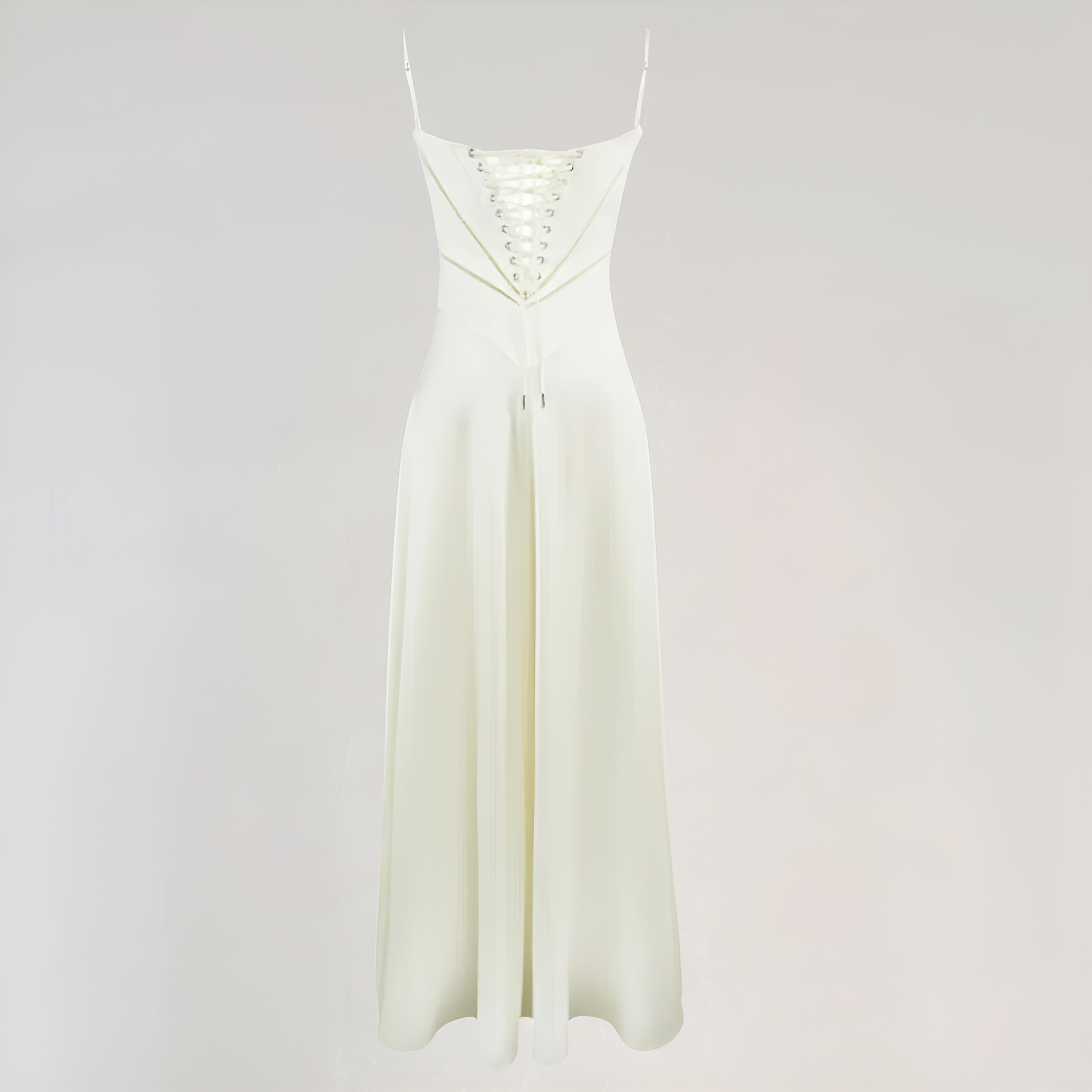 Ez a hosszú ruha kiemeli az alakot a fűző stílusú felsőrésszel, amely finoman hangsúlyozza a derekat. A folyékony szabás mozgást és eleganciát kölcsönöz, míg a fűzős hát romantikus és strukturált érintést ad. Ideális estélyekre, bálokra vagy ceremóniákra.