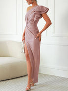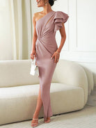 Ez a hosszú ruha folyékony vonalvezetésű, egy vállat szabadon hagyva. A réteges fodrok és az oldalsó hasíték egy csipetnyi kifinomultságot adnak hozzá. Tökéletes esküvőkre, estélyekre és más formális alkalmakra.