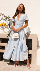 Ez a hosszú nyári ruha mély V-nyakkal és rövid ujjal rendelkezik, nőies és laza megjelenést kínálva. A derékban szabott fazon és a folyékony szoknya vonzó esést és nagy kényelmet biztosít. Tökéletes a strandra, városi sétákra vagy nyári bulikra.