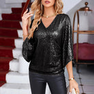 Ez a blúz kiemeli az alakot a finom V-nyakával és a kecses esésű harangujjaival. A csillogó flitterek diszkrét glamour érintést adnak a megjelenésedhez. Tökéletes estélyekre vagy különleges alkalmakra, ötvözi a kifinomult stílust és a maximális kényelmet.
