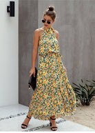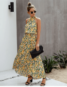 Denne bohemske lange kjolen tiltrekker seg med sitt strålende blomstertrykk og sitt raffinerte bånd som kan knytes rundt halsen. Den flytende silhuetten fremhever subtilt figuren samtidig som den gir optimal komfort for varme dager. Perfekt for en sommerutflukt eller en tur i byen.