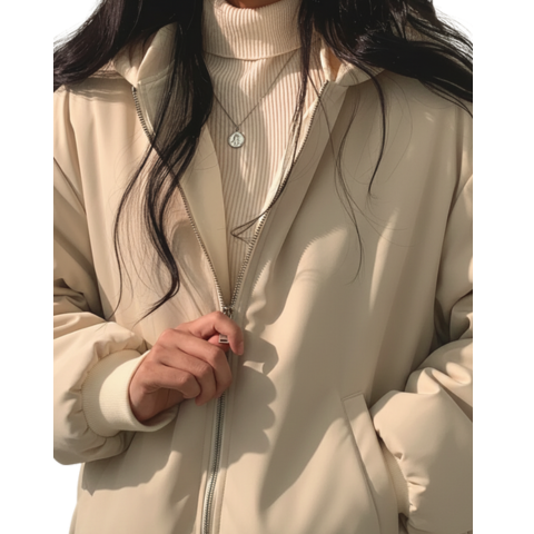 Denne jakken skiller seg ut med sitt reversible design, som tilbyr en lys grå side med en glatt visuell overflate og en elfenbensfarget side med et mer volumøst utseende. Hver side gir et annet utseende: den ene for en enkel stil, den andre for et mer omsluttende og teksturert utseende. Den korte passformen, den integrerte hetten og det generøse volumet gjør den til et ideelt plagg for kalde dager når du ønsker å variere antrekket uten å bytte klær.