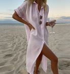 Deze elegante hemdjurk heeft hoge splitten en knoopdetails, wat zorgt voor een moderne uitstraling. Perfect voor verschillende gelegenheden, het combineert stijl en comfort.