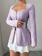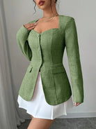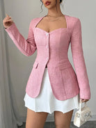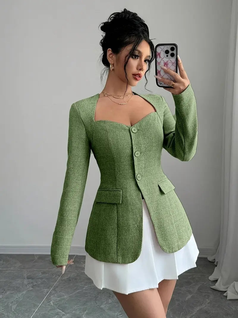 Această jachetă cu nasturi evidențiază silueta cu croiala sa ajustată și gulerul pătrat modern. Perfectă pentru un aspect elegant și feminin, se poartă la fel de bine la birou cât și la ieșiri. Designul său rafinat și nasturii delicati adaugă o notă de rafinament atemporal ținutei tale.