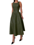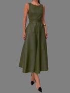 Această rochie fără mâneci oferă o croială trapez care flatează. Țesătura sa ușoară asigură un confort optim. Perfectă pentru zilele însorite.