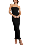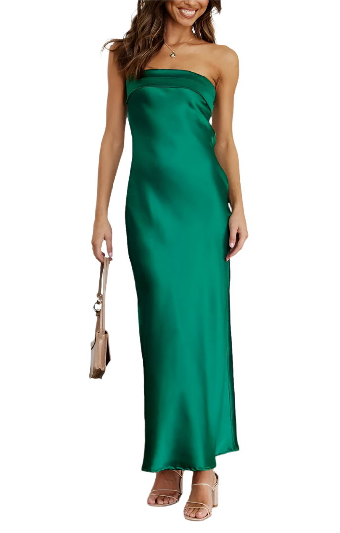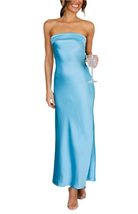 Această rochie lungă din satin, fără bretele, conturează o siluetă elegantă și feminină. Fluidă și ușoară, este ideală pentru serile de vară, nunți sau ocazii speciale. Căderea sa mătăsoasă aduce o notă de rafinament, asigurând în același timp un confort optim. Disponibilă în mai multe culori pentru a se potrivi tuturor stilurilor.