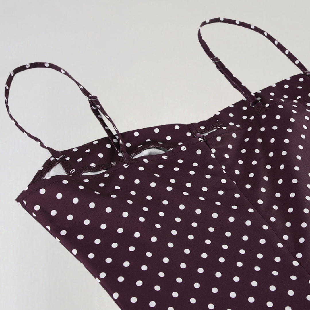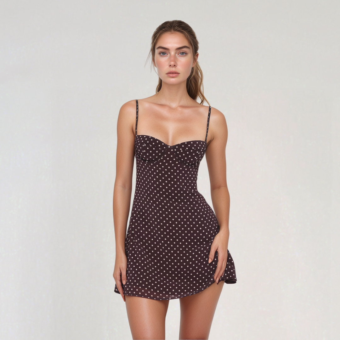 Tieto krátke šaty očarujú svojím ženským strihom, jemnými ramienkami a srdcovým výstrihom. Dôvtipný bodkovaný vzor na čokoládovom pozadí im dodáva retro a elegantný vzhľad. Ideálne na žiarenie počas slnečných dní alebo letných večerov.